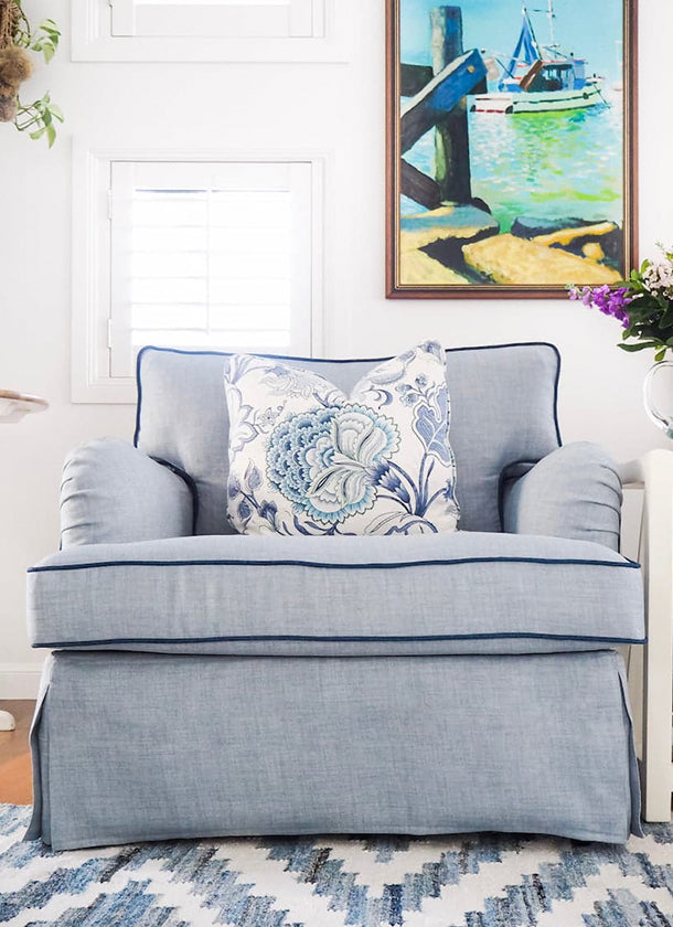 Textured Weave Frost-Slipcover mit kontrastierender Textured Weave Denim-Paspelierung