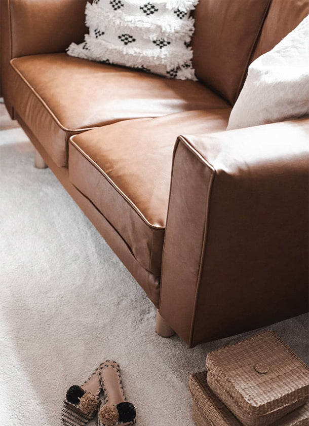 Anstatt der standardmäßigen einfachen Nähte entscheiden sich manche für einen subtilen "Hingucker", um die Form des Sofas zu betonen. Hier könnte passender Paspelbesatz funktionieren, aber beachten Sie, dass nicht das gesamte Sofa umrandet wird.