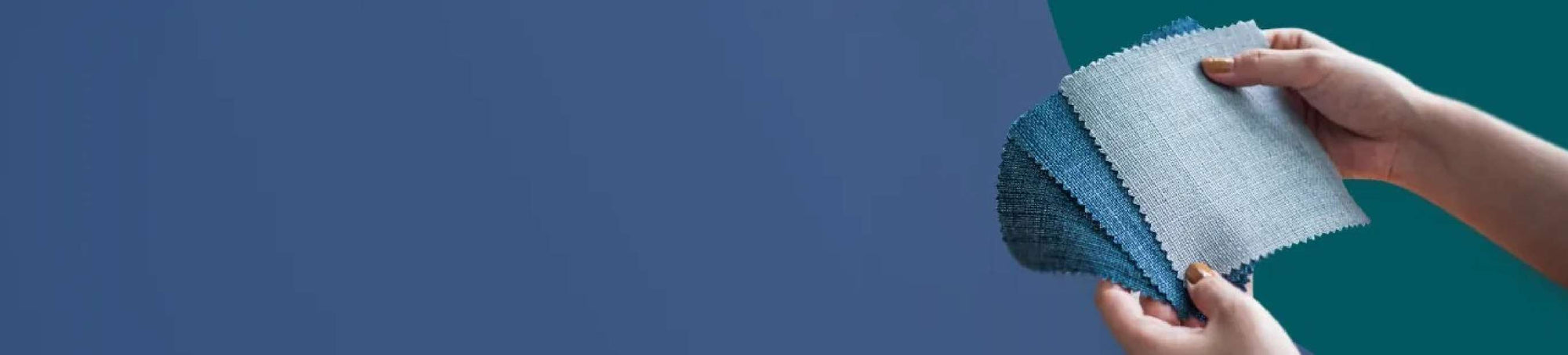 Woman arranging fabric sample swatches on the sofa to find the perfect match